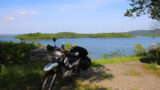支笏湖の周辺、少し雨が降っているが小雨の中、湖と恵庭岳を眺める。バイクを停車して、景色を楽しむぐらいの余裕はある。